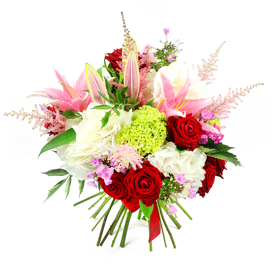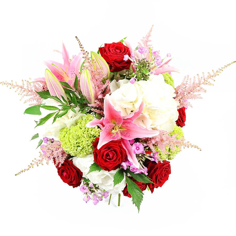 Our Luxurious Floral Symphony bouquet is a masterpiece of nature, featuring an exquisite selection of red roses, white hydrangea, pink lilies, pink astilbe, green celosia, and phlox. Each flower is hand-selected to ensure exceptional quality and freshness.