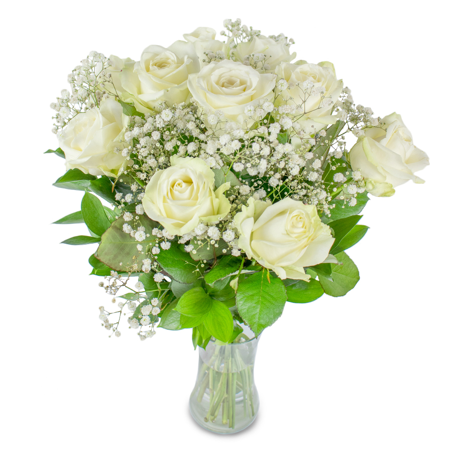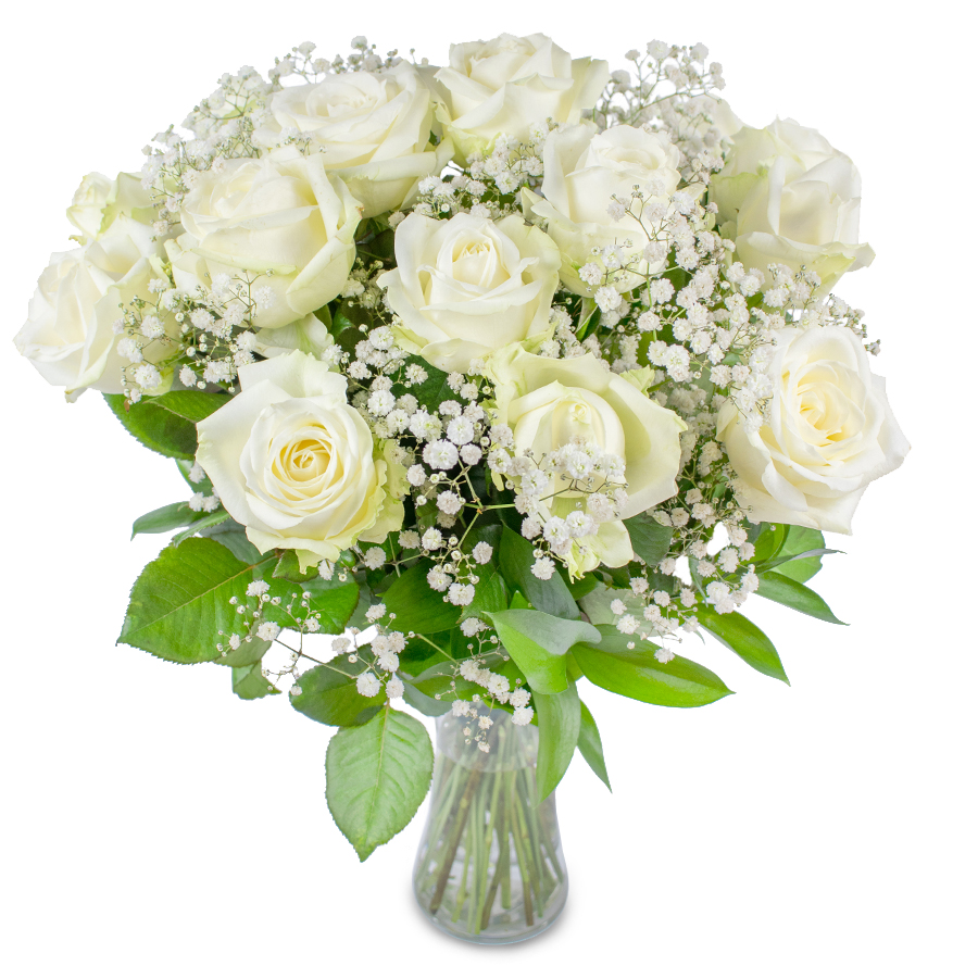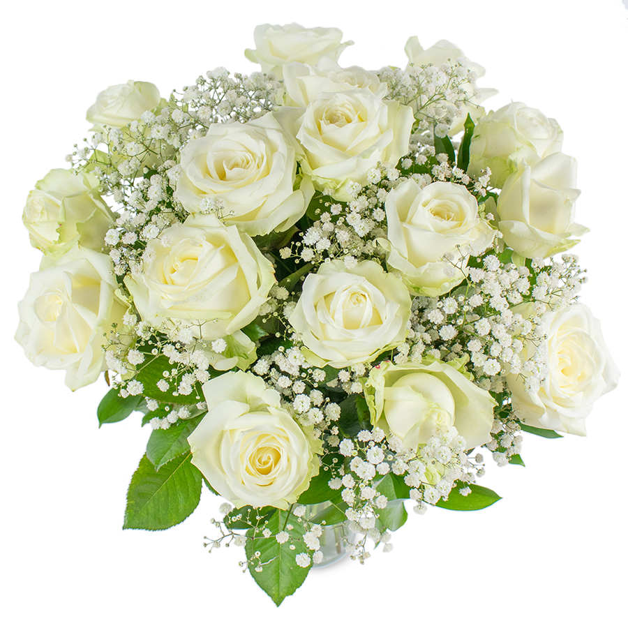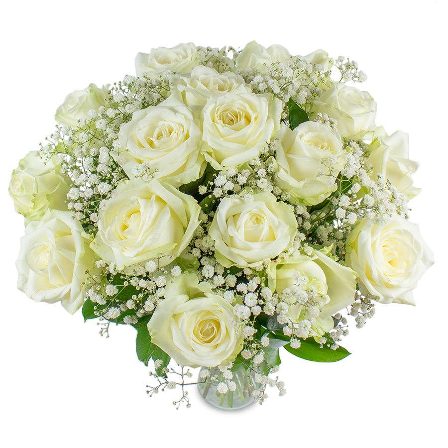 Our beautiful white roses are the perfect symbol of elegance, handpicked for their pristine freshness. This unique bouquet features flawless white roses complemented by delicate gypsophila and lush aspidistra leaves, crafting a visually appealing and unique arrangement.