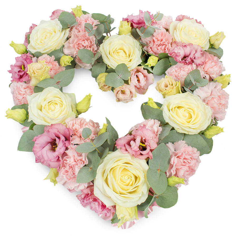 Celebrate cherished memories with this beautiful and unique flower arrangement. Combining elegant white roses, soft pink carnations, graceful pink lisianthus, and aromatic eucalyptus, this bouquet is a perfect tribute.